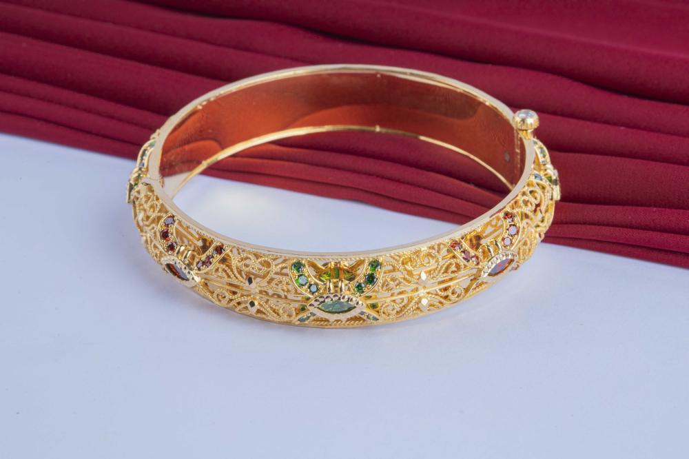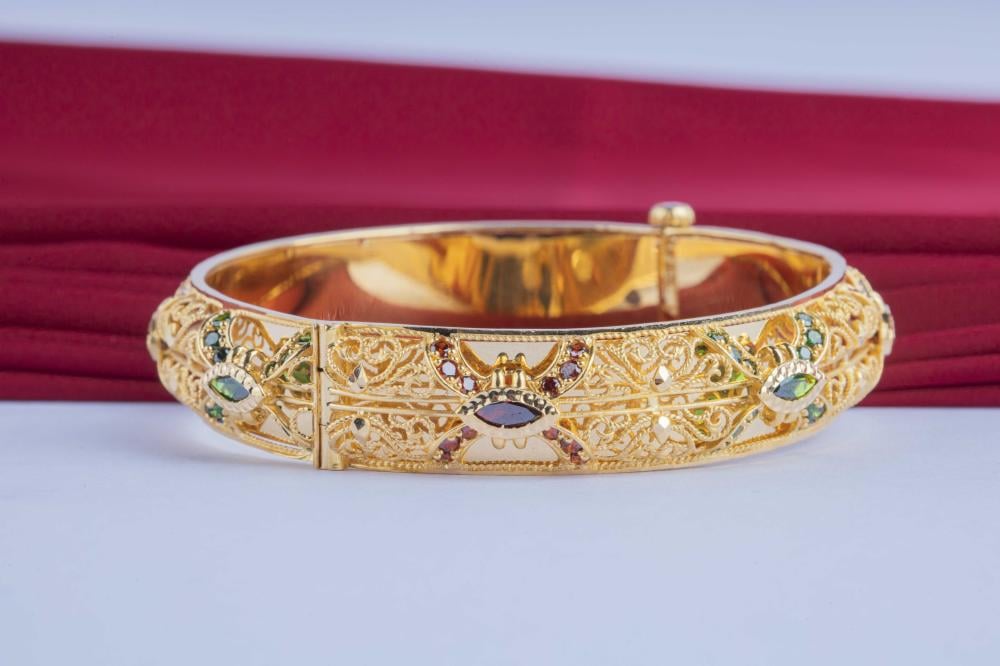 اسوارة بنجل تصميم بحريني شغل الليزر مع الفص الأخضر والعنابي عيار 21 الوزن 28.29 جم