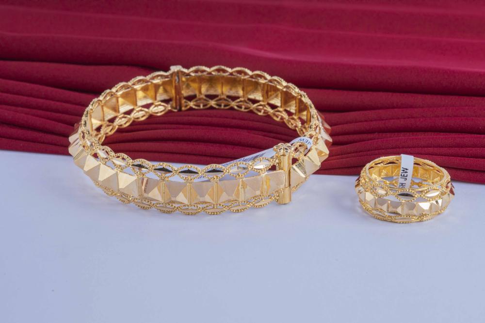 تصميم تراثي أنيق يجسد جمال الحرف اليدوية البحرينية. اسوارة بنجل مع خاتم متناسق، مصنوعة بدقة من ذهب عيار 21 بوزن 25.39 جرام، تضيف لمسة فاخرة ومميزة لإطلالتك.