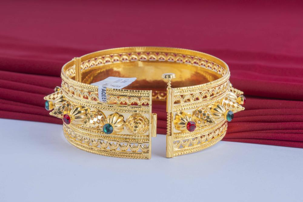 اسوارة ذهب بنجل تصميم بحريني مع الفص الأخضر والعنابي عيار 21 الوزن 36.8 جم