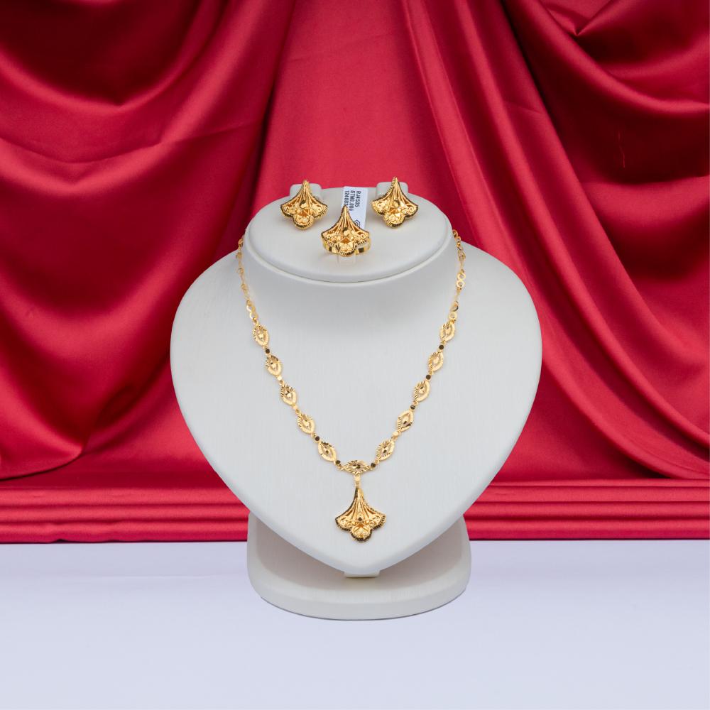 - يتم تصنيع الطقم باستخدام تقنيات الحرف اليدوية الحديثة لضمان دقة وجودة التفاصيل. اللمسات النهائية من التلميع تعزز من بريق الذهب وتجعله يلمع بشكل مذهل تحت الضوء.