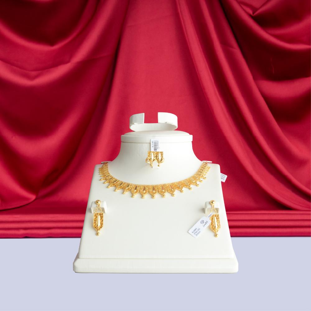 مصنوع من ذهب أصفر نقي عيار 21، يضمن هذا الطقم جودة عالية ولمعانًا دائمًا يدوم لسنوات، ليكون قطعة مميزة تضيف لمسة فخامة إلى إطلالتك.