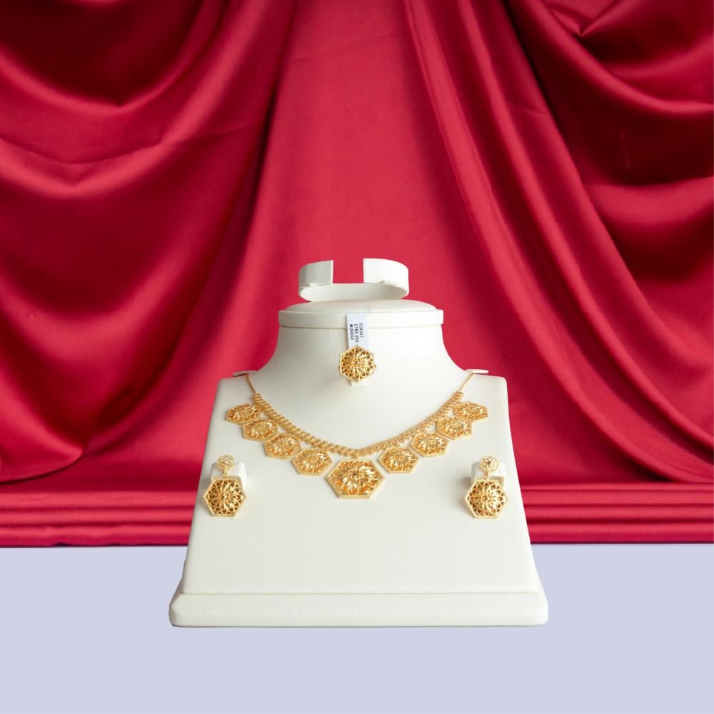 مصنوع من ذهب أصفر نقي بعيار 21، يوازن هذا الطقم بين الوزن المثالي والتصميم المتقن، ما يجعله خيارًا مثاليًا لكل سيدة تبحث عن الأناقة الخالدة والتميّز في أدق التفاصيل.