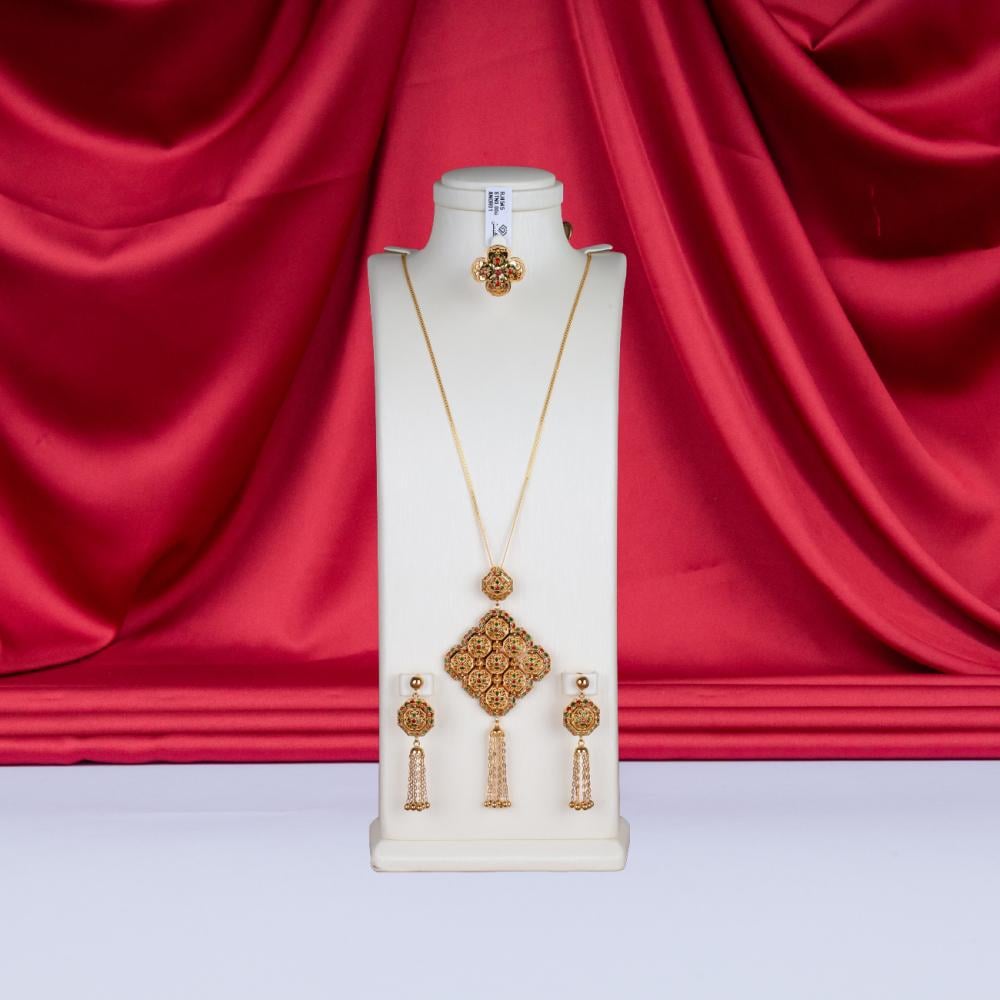 تميزي بإطلالة راقية وفاخرة مع الطقم الذهبي المصنوع من ذهب عيار 21 بوزن 30.83 جرام، الذي يتميز بتصميمه الفاخر والمميز. يجسد هذا الطقم الجمال الفاخر في كل تفصيل، ويتميز بحرفية استثنائية في الصنع. يمتاز بالتصميم الذي يجمع بين اللمسات العصرية والتفاصيل الدقيقة، مما يجعله الاختيار المثالي للسيدات اللاتي يفضلن التميز والأناقة في إطلالاتهن. سواء كنتِ في مناسبة خاصة أو تسعين إلى إضافة لمسة من الفخامة لمظهرك اليومي، سيمنحك هذا الطقم إطلالة ساحرة.